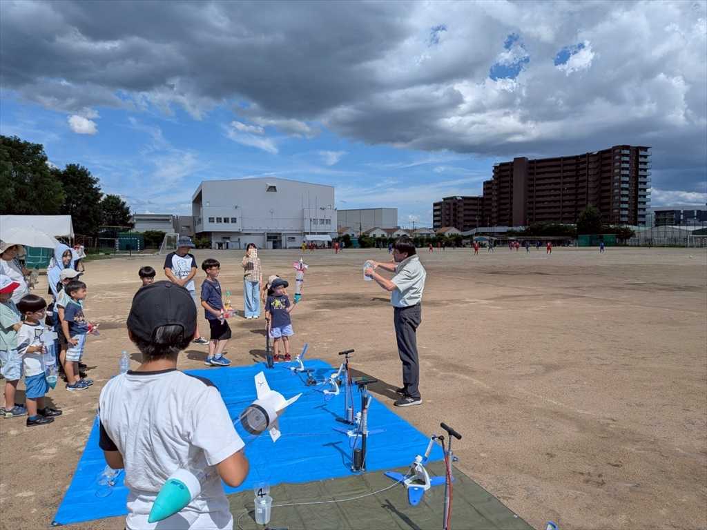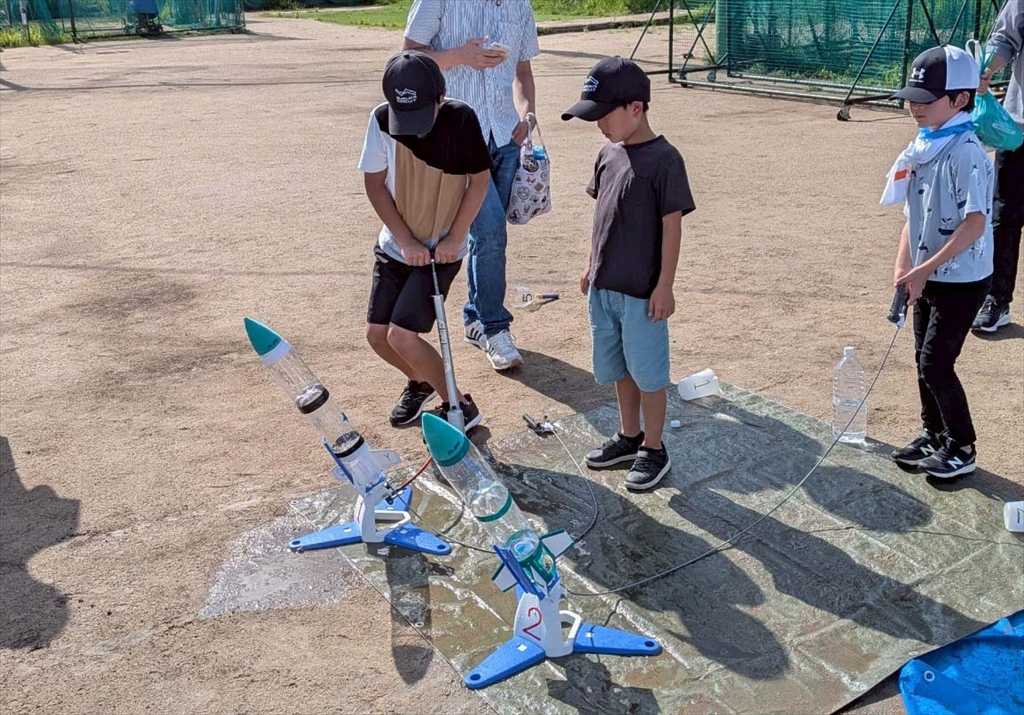 飛ばすのは広い運動場。周りの安全確認を忘れずに! 入れる水の量はどれぐらいがちょうどいいでしょうか?
